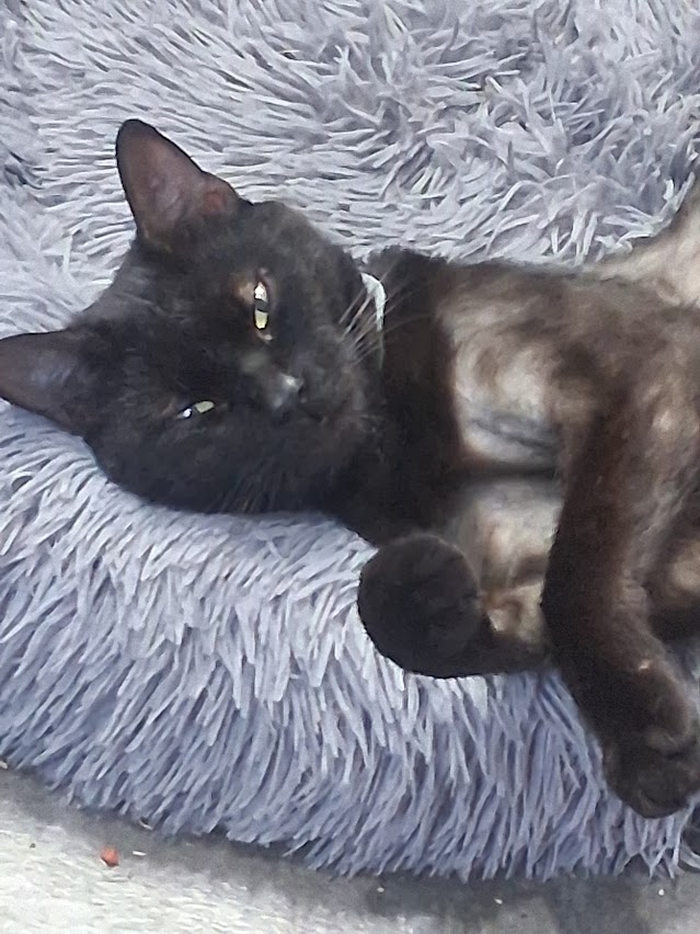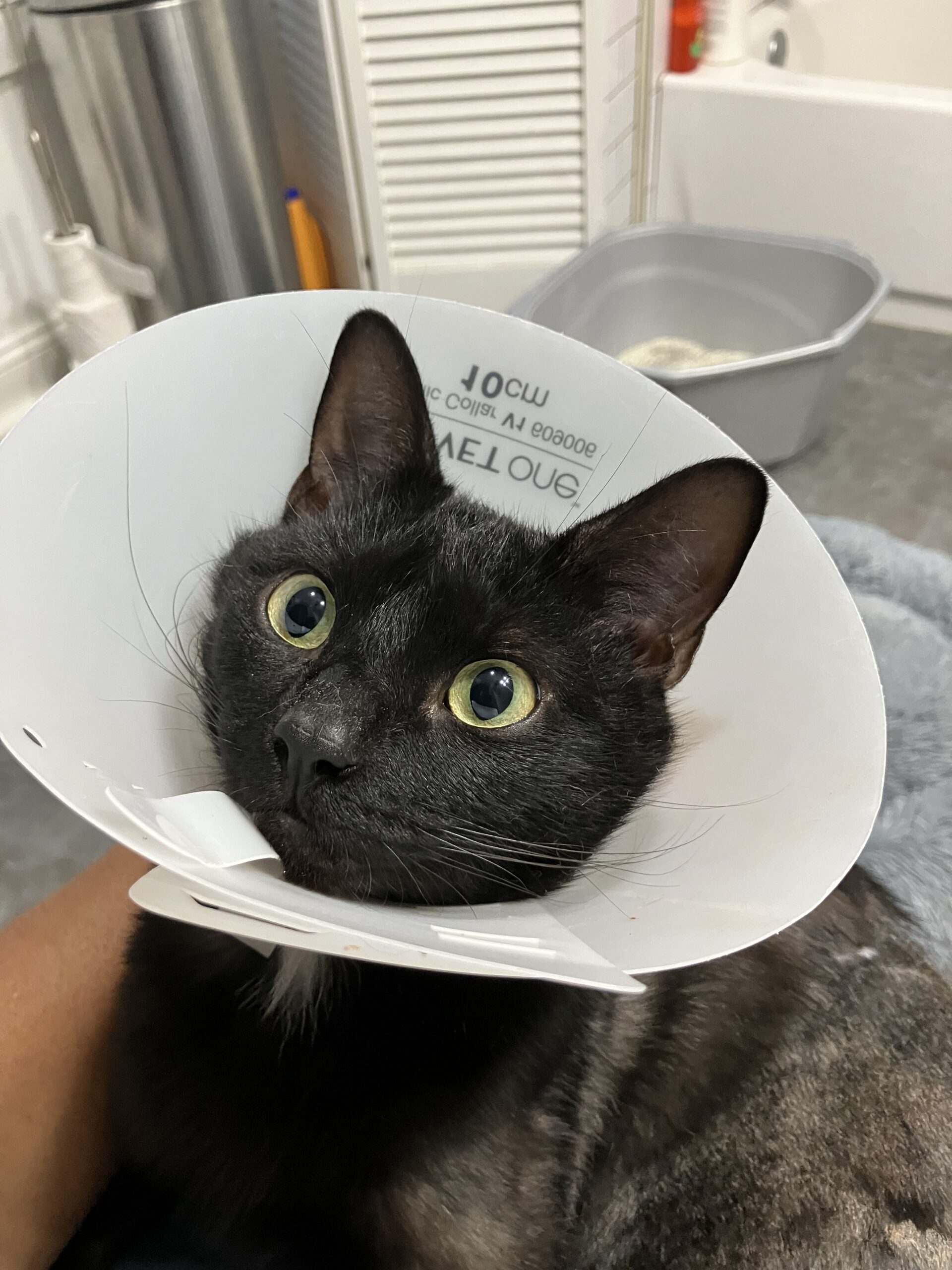 “Our little corner store kitty, now renamed Bo, is doing well. Bo is short for Bodega, as we found him in front of a mom-and-pop corner store. He had a really rough first night after surgery, but he is back to being as sweet as a button!! He’s in a big crate in the bathroom for now, and is taking his meds on schedule with paté food (spread throughout the day and night). We let him out of the crate for three to five minutes at a time in the bathroom so he can get head rubs and stretch his legs a little. He is not a fan of the physical therapy the vet recommended, but we are still trying. Thank you all again for everything!!! Bo is a joy and a bit of a ham! If we leave him in another room too long, he will pout until he gets to cuddle up in our bed again 🙂 He sure does love attention!”