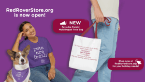 The store also offers multilingual “Pets Are Family” tote bags. Carry the belief that Pets Are Family on the run, whether running errands or headed out with a furry family member. The translations featured on the bag — including Spanish, Arabic, Mandarin Chinese, Japanese, Vietnamese, and Tagalog — are languages spoken by our RedRover community, reflecting our commitment to supporting pet families from every background.